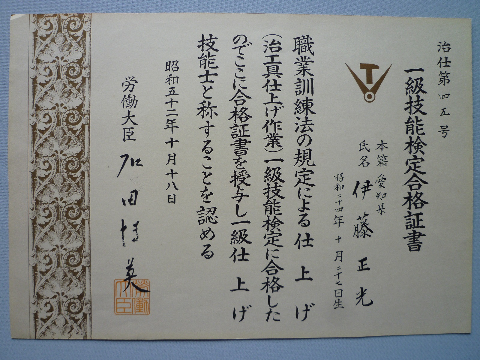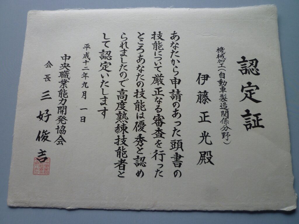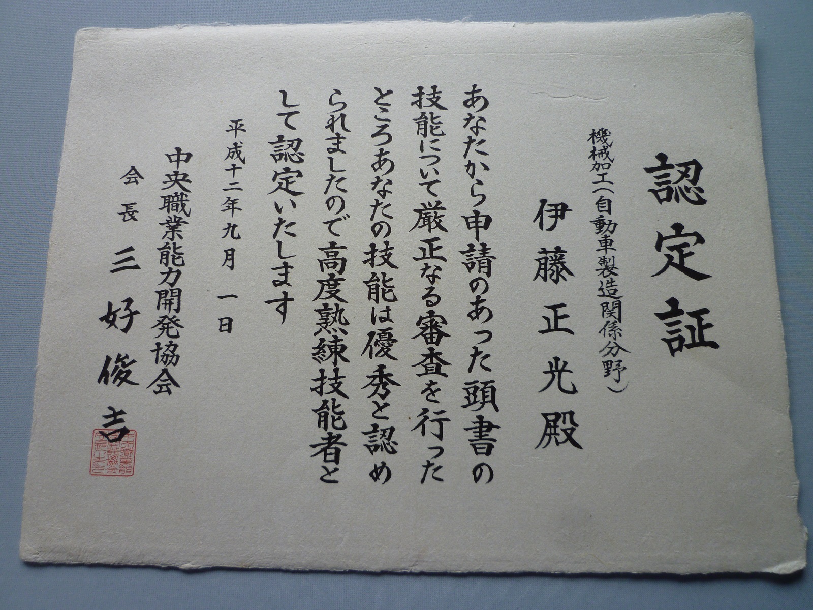 • トヨタの中で「トップ技能者」として認められ、かつトヨタ自動車の技術者の代表として受験し、正式に高度熟練技能者として認定された証である賞状です。