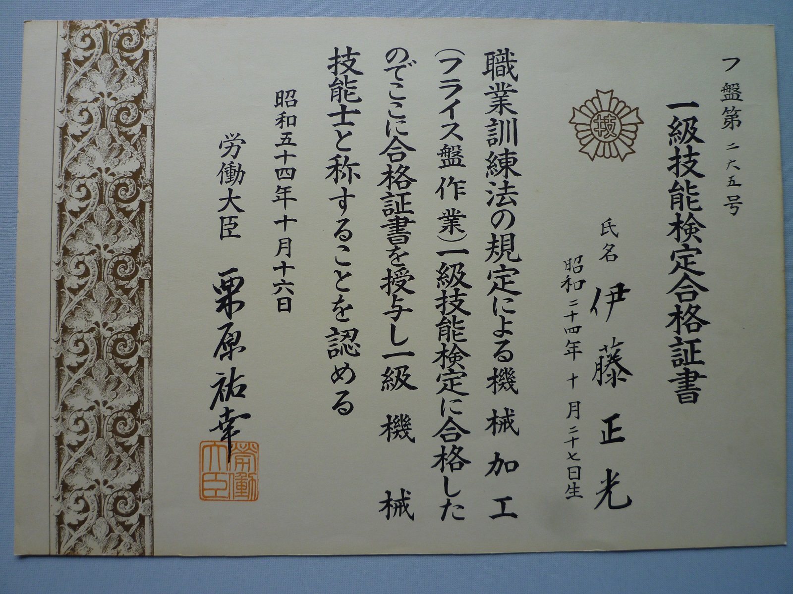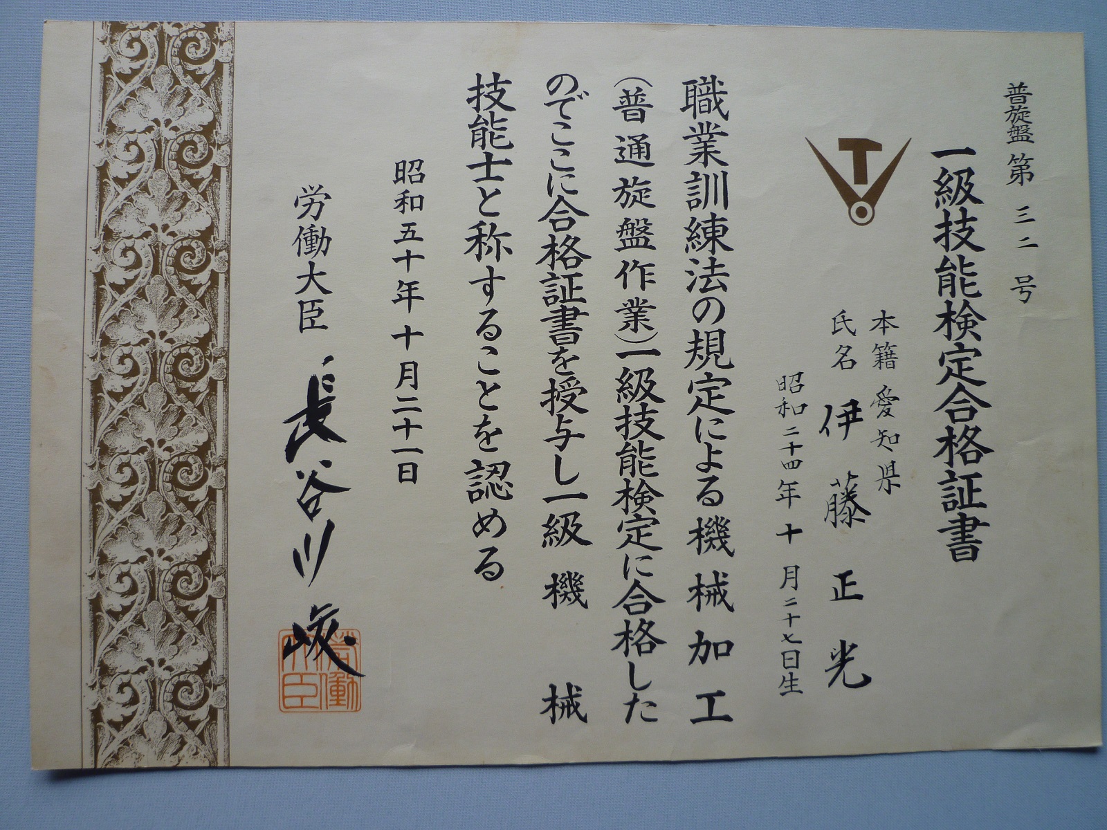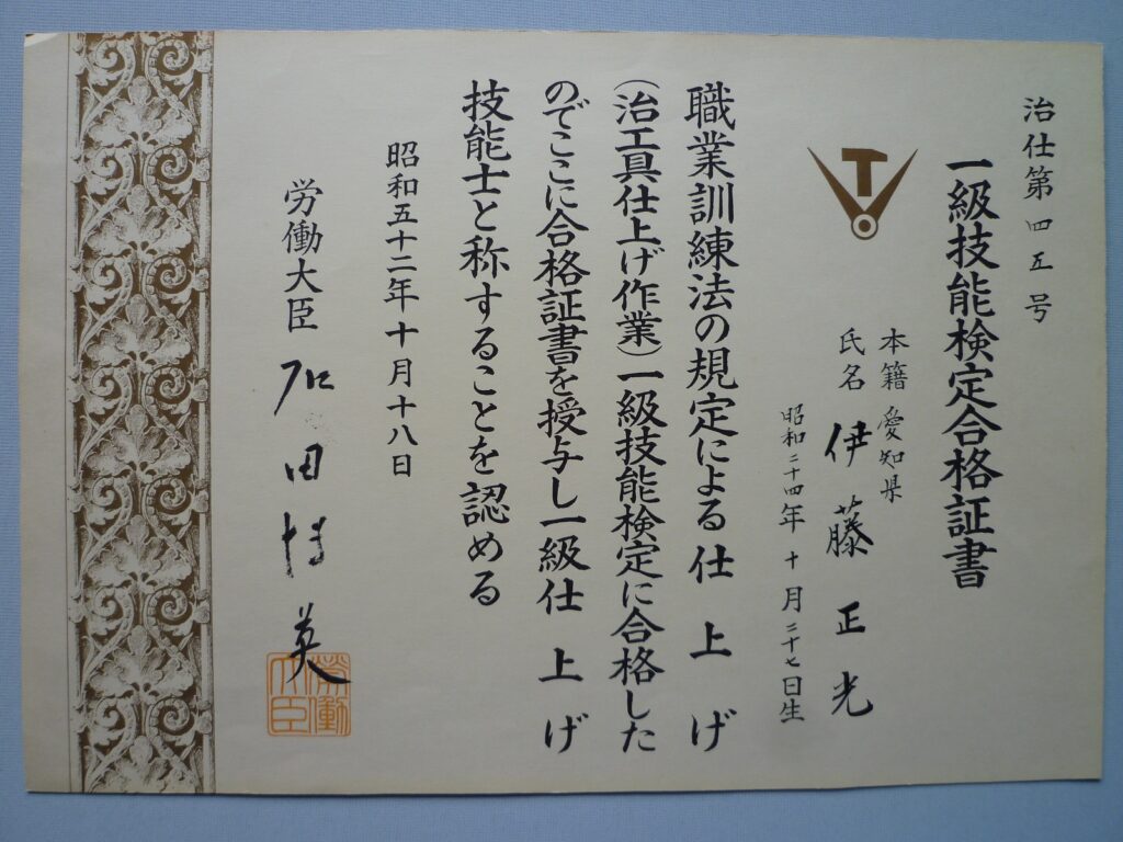 • トヨタの中で「トップ技能者」として認められ、かつトヨタ自動車の技術者の代表として受験し、正式に高度熟練技能者として認定された証である賞状です。